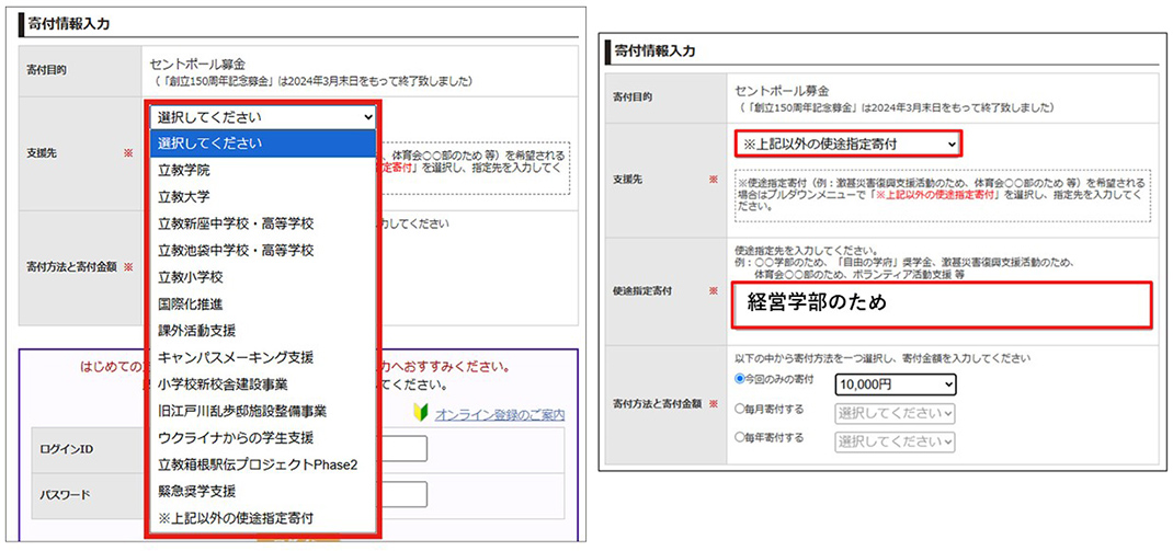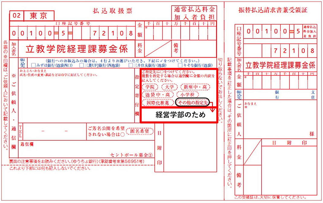 立教学院の「セントポール募金」では、ご寄付の際に使途をご指定いただけます。指定寄付欄に「経営学部のため」とご記載いただくと、経営学部で皆さまの寄付金を活用させていただくことが可能となります。この機会にぜひご検討くださいますと幸いです。